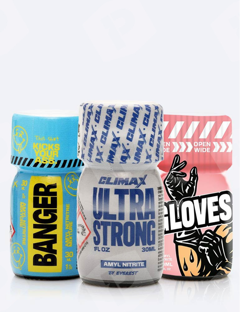 O Pack Trio Explosivo 30ml reúne Banger de impacto poderoso, Gloves para noites tórridas e Climax Ultra Strong apogeu sensorial com nitrito de amilo com gargalo largo para sensações marcantes e euforia explosiva.